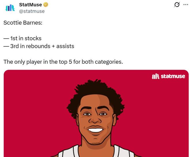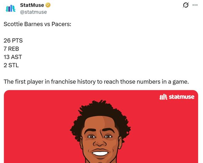 本场巴恩斯16中10,高效砍下26分7板13助2断1帽全能数据,成为队史首位至少能够交出这一数据的球员。