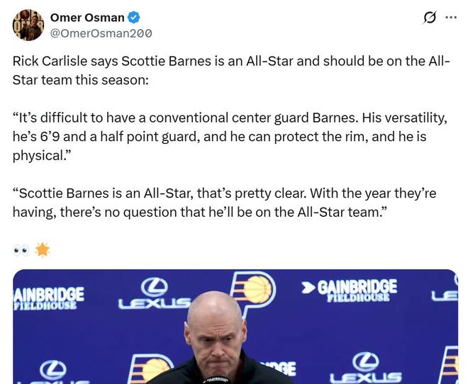 面对巴恩斯这样的表现,作为对手的卡莱尔也在赛后对其大加赞赏:“巴恩斯是一名很难被定义为后卫或者中锋的球员,他的全面性毋庸置疑,他拥有6尺9英寸的身材,却能胜任控卫位置,不仅能够保护篮筐,还能应对激烈的身体对抗,毫无疑问,他是一名全明星球员,就他本赛季的表现而言,他入选全明星是板上钉钉的事情。”