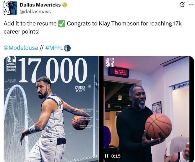 独行侠官方也专门晒图庆祝克莱连续两场比赛迎来里程碑,在本场总得分突破17000分大关之前,克莱在前一场对阵爵士队的比赛中,生涯三分命中率才超越利拉德升至NBA历史第四。