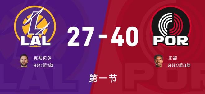 比赛开始湖人获得第一攻,卡马拉主防詹姆斯,克莱伯挡开顺下上篮被犯规两罚全中开局,西索科失误詹姆斯反篮不中,霍乐迪转换轻松上篮得分,西索科空切抛投也有开拓者4-2反超。克莱伯三分将功补过,夏普冲击篮下被犯规两罚一中比分追平。斯玛特连得5分,克勒贝尔上篮湖人打了一波7-3将比分改写成12-8,克林根内线吃饼制霸内线,克林根三分不中开拓者前场球,没有中锋内线太难了,卡马拉切入直接获得罚球机会两罚一中分差来到1分,克勒贝尔空切折叠暴扣点燃全场,克林根快速到内线又被犯规了,6分55秒比赛进入官方暂停!回来比赛克林根两罚一中12-14,湖人连续进攻不成,夏普三分,西索科两罚一中开拓者16-14反超2分,詹姆斯下场休息,蒂米上来连得5分湖人还反超1分,节末开拓者利用内线优势频频站上罚球线,首节罚了22次,首节战罢湖人27-40落后!