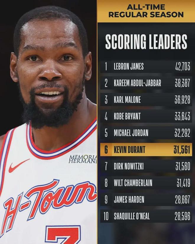 北京时间1月19日,火箭119-110战胜鹈鹕。火箭25胜15负西部第五,领先湖人0.5个胜场。杜兰特超越诺维斯基(31560分),升至NBA历史得分榜第六!按照本赛季场均26.1分计算,KD再打28场即可超越乔丹(32292分)。