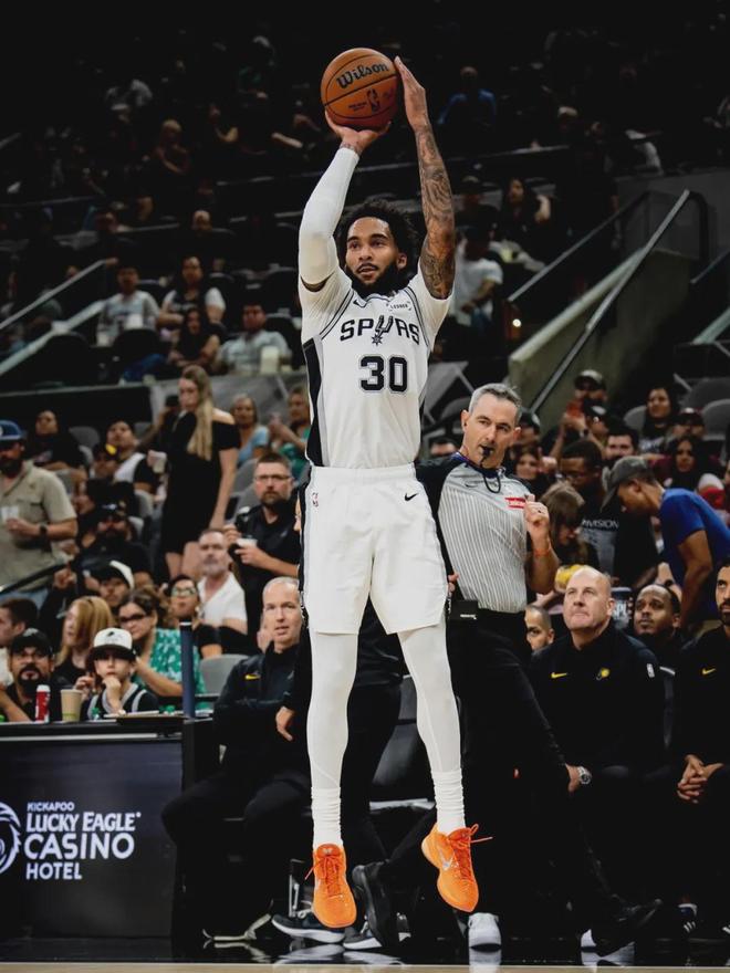 2024-25赛季,尚帕尼为马刺打了82场,其中29场首发。场均出战23.6分钟,得到9.9分3.9篮板1.4助攻0.7抢断0.9失误,三项命中率:41.5%,37.1%,90.4%。本赛季尚帕尼可以说是全面进化,而且他才24岁,还有进步空间。