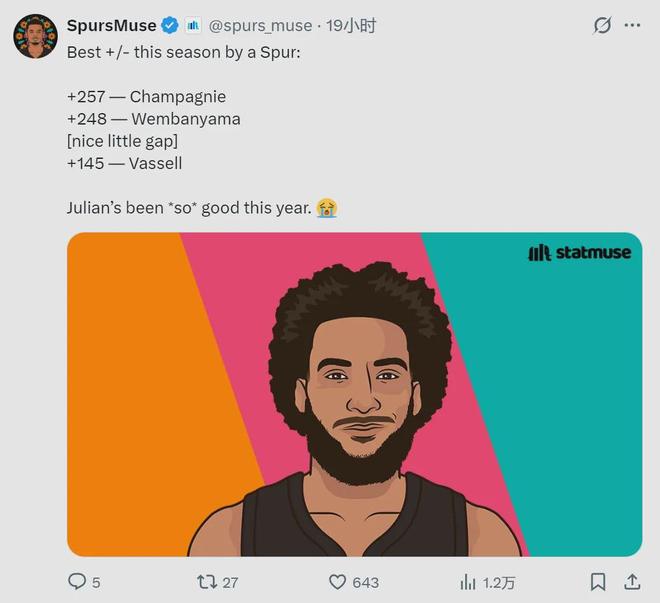 马刺媒体SpursMuse晒出一组数据:尚帕尼+257高居队内第一;文班亚马+248排名第二;瓦塞尔+145,马刺队内第三。尚帕尼本赛季场均正负值+5.7,联盟第17,同样是马刺队内第一;瓦塞尔+4.5,联盟第26,队内第二。