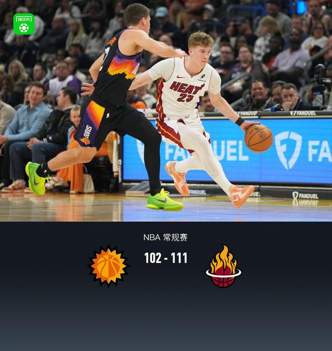 第四节太阳狄龙-布鲁克斯拿下6分,热火哈克斯拿下11分,最终太阳102-111不敌热火