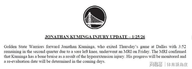 之前啊,巴特勒受伤,库明加这小子闹完别扭终于肯上场打球了,本以为能好好表现一番,结果才打了2场就又受伤了。今天勇士官方正式宣布,库明加这左膝过度伸展,都搞出骨挫伤了,具体啥时候能再上场,那得等过几天复查之后才能知道。这交易截止日眼看着就剩没几天了,您说这库明加还能像商品一样被“打包”交易出去吗?