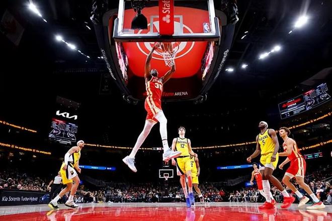在湖人没打出来,但内线新星加盟老鹰后立刻打出了亮眼的表现