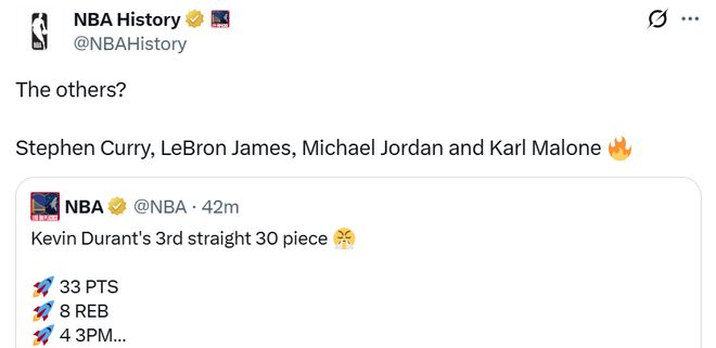 这也让杜兰特成为历史第5位在37岁后还能连续3场30+的球员,成功比肩乔丹、詹姆斯、库里和卡尔-马龙。