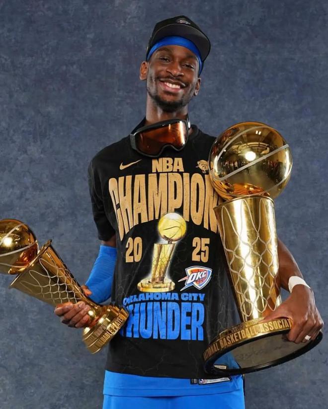 在2000年之后NBA出现过科比、詹姆斯、库里、字母哥、约基奇等超巨,但没有球员能在一个赛季内拿下MVP、FMVP、得分王,过了四分之一个世纪后亚历山大在24-25赛季达成了这一成就。这个赛季SGA常规赛出战76场,场均砍下32.7分5篮板6.4助攻,投篮命中率为51.9%,三分命中率为37.5%,入选了一阵,拿下了生涯首个MVP和得分王。总决赛上亚历山大带领年轻的雷霆历经抢七大战击败了步行者拿下队史首冠,他场均砍下30.3分拿下了个人首个FMVP,他也就此比肩贾巴尔、乔丹、奥尼尔,成为目前最后一个在一个赛季内包揽MVP+FMVP+得分王的球员。