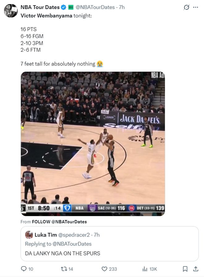 这场比赛马刺惨败的罪人就是核心维克托-文班亚马,他作为一名身高7尺4寸(裸足达到2.24米)的内线,他在面对奎因、玛特科维奇、锡安时打不到内线,他更是被胖虎各种顶着上篮,文班亚马的身体对抗差到极致。