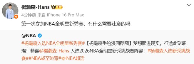 北京时间1月27日,NBA官方晒出了杨瀚森的手绘漫画形象,并配文写道:“梦想照进现实,征途此刻璀璨!恭喜杨瀚森入选2026NBA全明星新秀挑战赛阵容。”杨瀚森本人转发了这条社媒,并回应道:“第一次参加NBA全明星新秀赛,有什么需要注意的吗?”