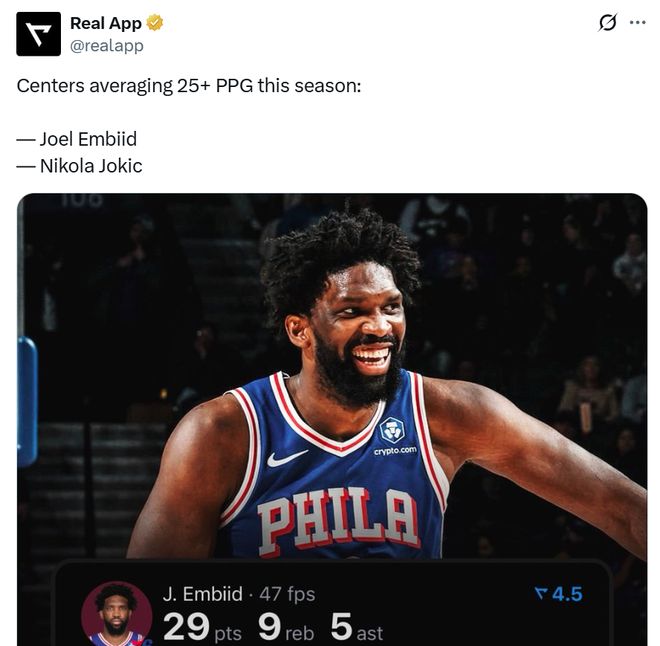 这也是恩比德本赛季重回赛场后表现的缩影,本场比赛后,恩比德场均得分来到25.2分,他与约基奇(29.6)是联盟本赛季仅有的两名场均得分超过25分的中锋。