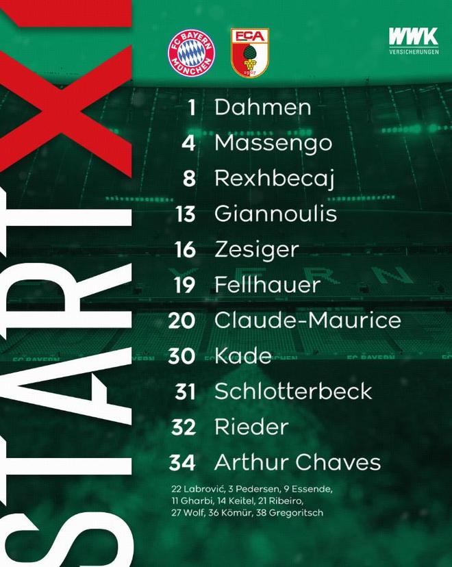 奥格斯堡首发:1-达门、34-阿图尔-查韦斯、31-凯文-施洛特贝克雷、16-泽西格尔、13-吉安努利斯、4-马森戈、19-菲尔豪尔、8-雷克斯贝卡伊、20-毛里斯、32-法比安-里德、30-安东-卡德