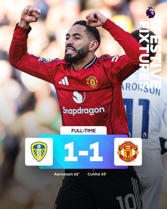 北京时间1月4日20:30,英超联赛第20轮,利兹联主场迎战曼彻斯特联。上半场,库尼亚凌空远射破门,但越位在先被判无效!勒温头球击中立柱;约罗近距离头球攻门被佩利扑出。下半场,阿隆森破门;齐尔克泽替补秒送助攻,库尼亚扳平比分!奥卡福倒钩被拉门斯神扑化解;齐尔克泽横传,舍什科门前推射失良机!最终,曼联1-1战平利兹联,近5轮英超仅1胜。