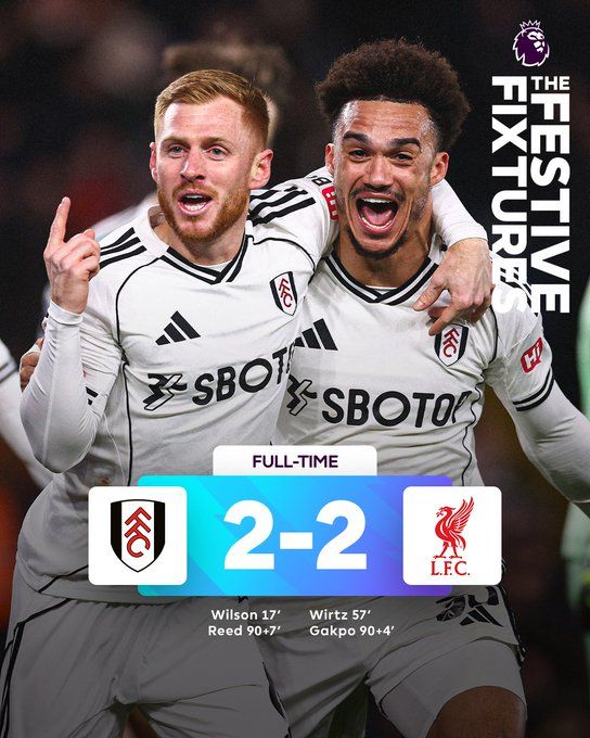 北京时间1月4日23:15,富勒姆在主场迎战利物浦。上半场,加克波错失单刀,哈里·威尔逊低射破门。下半场,麦卡利斯特头球击中横梁,维尔茨扳平比分,威尔逊吊射中框,加克波补时破门,里德替补登场轰进世界波读秒绝平。最终富勒姆2-2利物浦。本场比赛过后,利物浦积34分依旧排在联赛第四,富勒姆积28分排在联赛第十一。