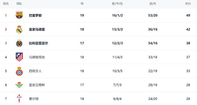 在积分榜上,巴萨的战绩是16胜1平2负,拿到49分排名榜首。皇马以42分排名第2。皇马在少赛一场的情况下落后巴萨7分。比利亚雷亚尔赢球后,暂时升到了第3名,总积分是38分。而马竞则以37分掉到第4名。第5的是西班牙人,拿到了33分。皇家贝蒂斯以28分排名第6。