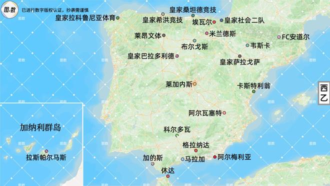 西甲地图已在上期发布,本期要讨论的是来自两个国家的西乙2025-26赛季的22支球队。