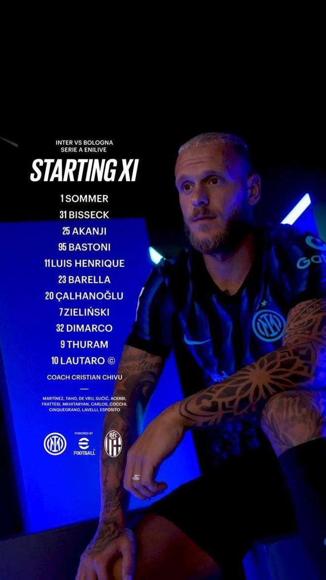 国米首发:1-索默、31-比塞克、25-阿坎吉、95-巴斯托尼、11-路易斯-恩里克、23-巴雷拉、20-恰尔汗奥卢、7-泽林斯基、32-迪马尔科、9-图拉姆、10-劳塔罗