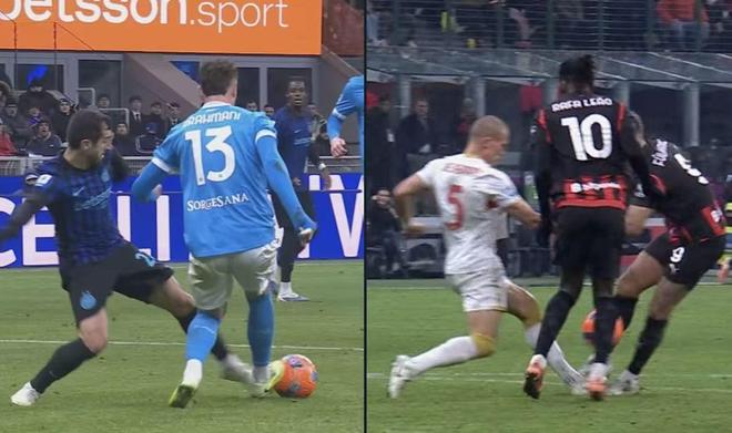 关于盛传的那些复盘,国际米兰对阵那不勒斯的判罚,与AC米兰与热那亚的判罚之间,并没有太多相似之处。简单来说,在第一种情况中,防守球员从未触碰到球;而在第二种情况中,防守球员抢先于红黑球员触球并解围成功。