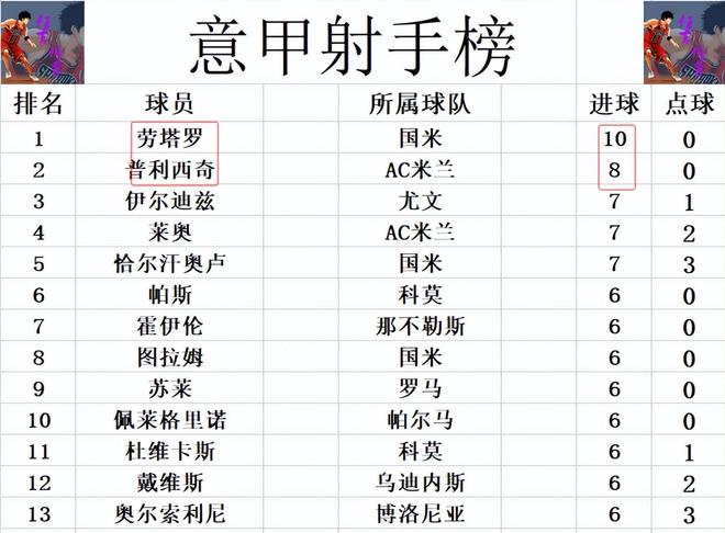 射手榜方面,前十没有变化,劳塔罗10球领跑,普利西奇8球紧随其后。伊尔迪兹,莱奥和恰尔汗奥卢7球并列第3,图拉姆今天未能进球,还是和苏莱,奥尔索里尼等人6球刚好挤入前十。