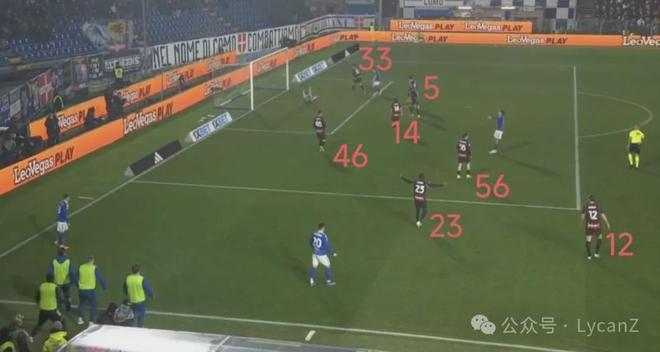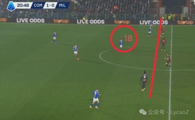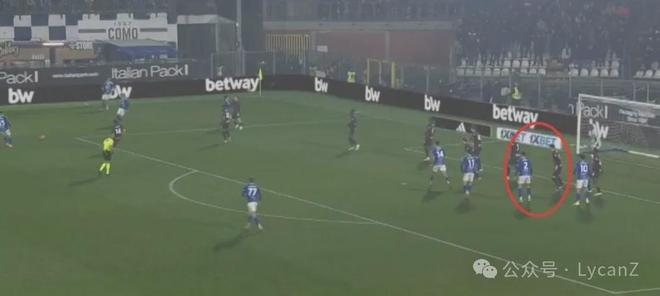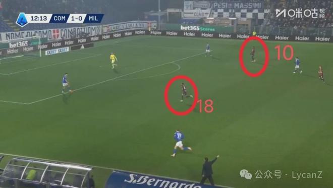 科莫一记斜传打向米兰的左路,靠着锋线两点压制米兰后卫,右后卫范德布雷普特拿球长驱直入畅通无阻并轻松起脚,莱奥换位在左路却没有起到相应的防守作用。直到第55分钟米兰2:1完成反超,阵型全面后撤收缩后,米兰10号才真正开始防守。