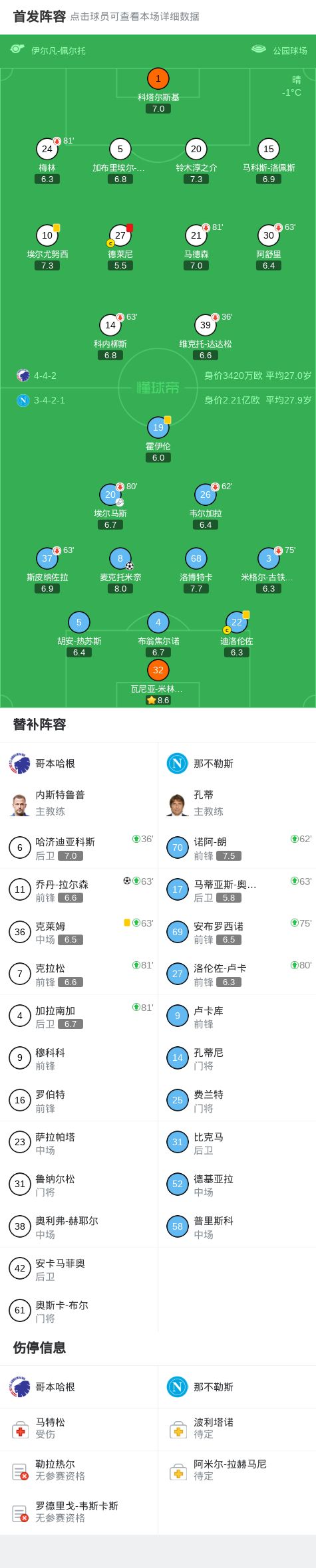 北京时间1月21日欧洲冠军联赛 联赛阶段 第7轮,哥本哈根对阵那不勒斯。哥本哈根乔丹-拉尔森破门。那不勒斯麦克托米奈破门。最终比分哥本哈根 1-1 那不勒斯。