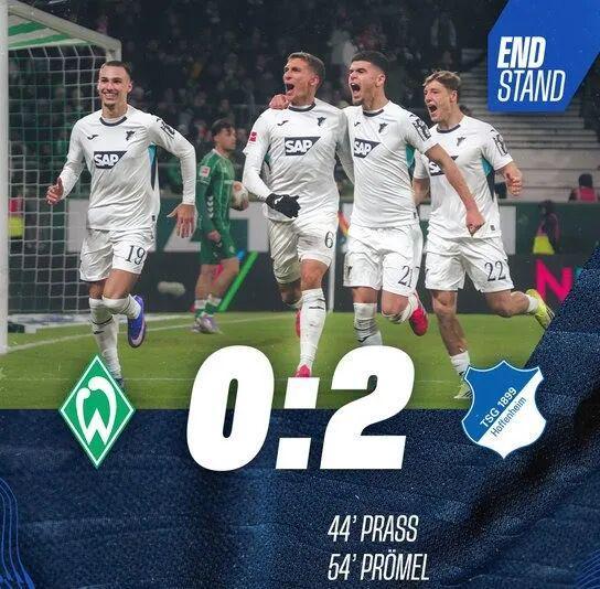 北京时间1月28日03:30,德甲联赛第16轮,云达不莱梅在主场威悉球场迎战霍芬海姆。上半场44分钟,克拉马里奇助攻亚历山大·普拉斯首开纪录。半场结束,云达不莱梅0-1霍芬海姆;易边再战,霍芬海姆中场沃特伯格飞铲红牌,普罗梅尔破门,最终云达不莱梅0-2霍芬海姆,云达不莱梅联赛9轮不胜,霍芬海姆联赛4连胜。