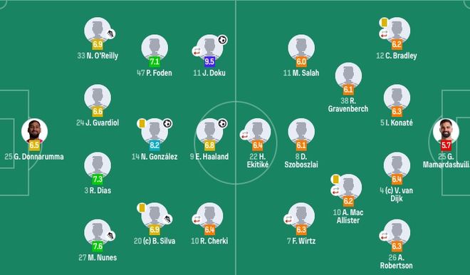 曼城首发:25-多纳鲁马、3-鲁本·迪亚斯、24-格瓦迪奥尔、33-奥赖利、27-努内斯、4-尼科·冈萨雷斯、20-B席、10-谢尔基(53'26-萨维尼奥)、11-多库(74'7-马尔穆什)、47-福登、9-哈兰德