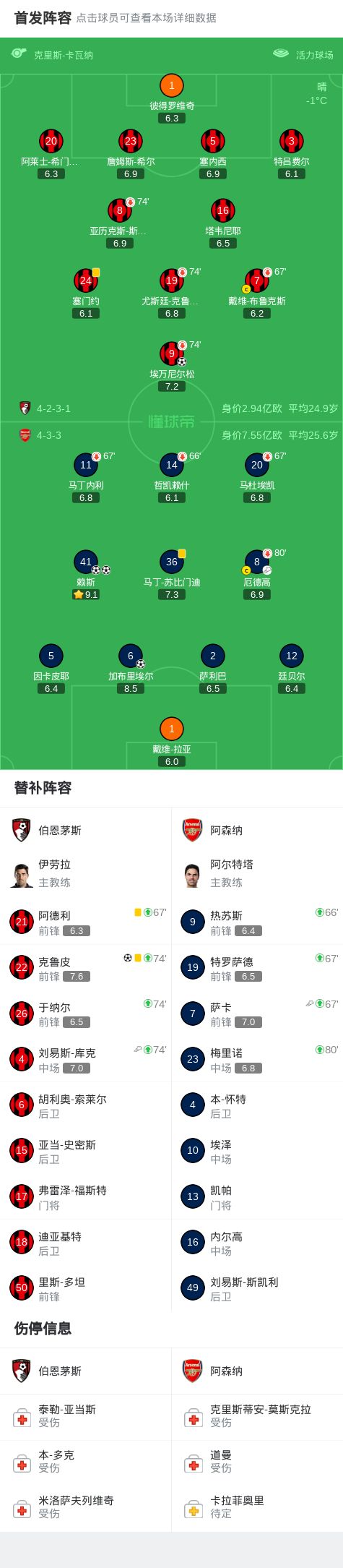北京时间1月4日1:30,英超第20轮继续进行,阿森纳作客活力球场挑战伯恩茅斯,本场主裁判为克里斯-卡瓦纳。上半场,加布里埃尔低级失误送大礼,埃万尼尔松笑纳大礼首开记录,随后加布里埃尔将功补过补射扳平比分。下半场,赖斯推射连下两城梅开二度,克鲁皮轰世界波扳回一城。最终,阿森纳3-2客胜伯恩茅斯。