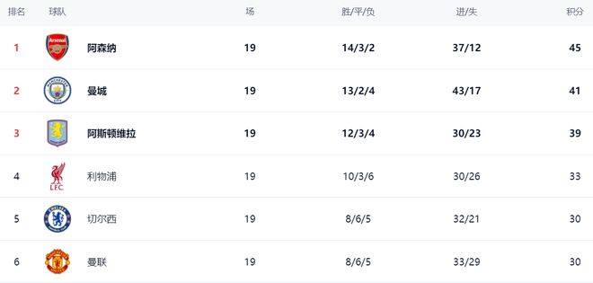 这一轮前3的球队命运各不相同,导致冠军争夺形势大变。阿森纳这一轮赢球,继续巩固榜首优势。阿森纳45分领跑。而曼城由于战平,丢掉了关键2分,与阿森纳的差距扩大到4分,以41分排名第2。第3名的阿斯顿维拉因为输给阿森纳,导致争冠形势迅速恶化,已经落后阿森纳6分了。