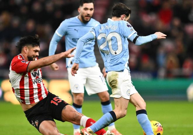 开场不久伯纳多-席尔瓦就进球了,只可惜因为越位被吹掉。桑德兰随后踢出了非常犀利的反击。布罗贝伊扛住迪亚斯后单刀射门,但被多纳鲁马化解了。福登的传球失误让马延达获得射门机会,但马延达射门踢偏了。哈兰德有打破僵局的机会,只可惜他的射门踢得太正。半场比分依然是0-0!曼城上半场控球率高达64%,但只有可怜的2次射门。而桑德兰上半场有6次射门,比曼城多了4次。