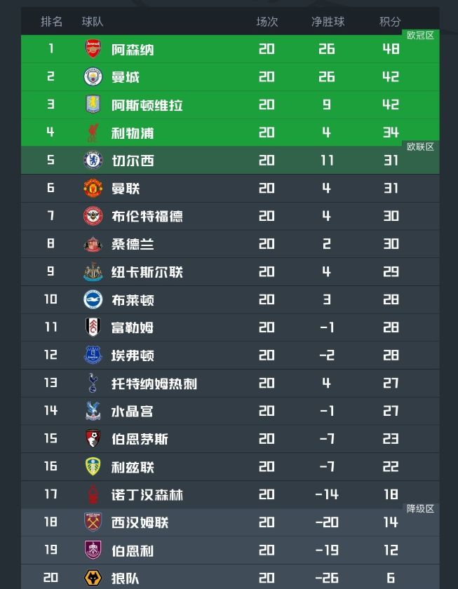 作为英超领头羊,阿森纳的压力不小,曼城与维拉一直在身后紧紧追赶;不过这2轮,阿森纳先是直接交锋击败维拉,这一轮又拿下了伯恩茅斯;迎来了一波联赛5连胜。前20轮过后已经拿到了48分;目前他们以6分的优势领跑积分榜;值得一提的是,枪手这前20轮的积分比当年不败战绩夺冠赛季还要高。