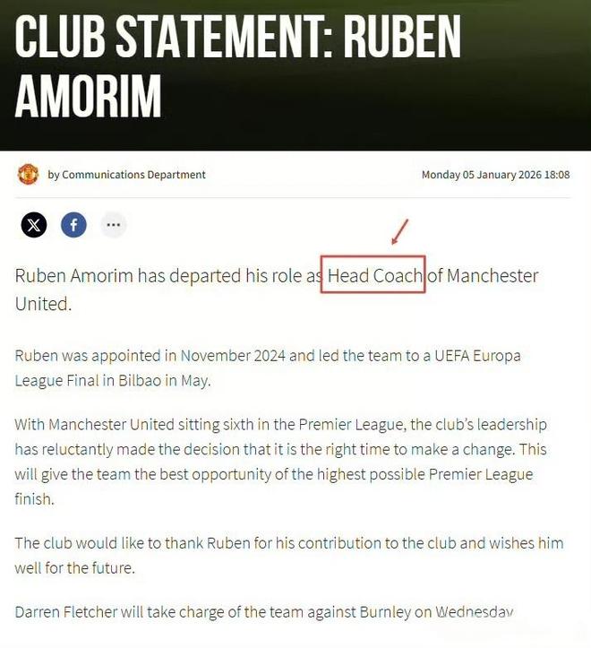 曼联管理层在宣布阿莫林下课的公报中写道:“曼联目前在英超联赛中排名第6,俱乐部高层经过深思熟虑,认为现在是做出改变的合适时机。”而且高层是用了coach而不是manager来描述阿莫林的,这也是让他很不满的点。看的出,高层是对他不认可的。
