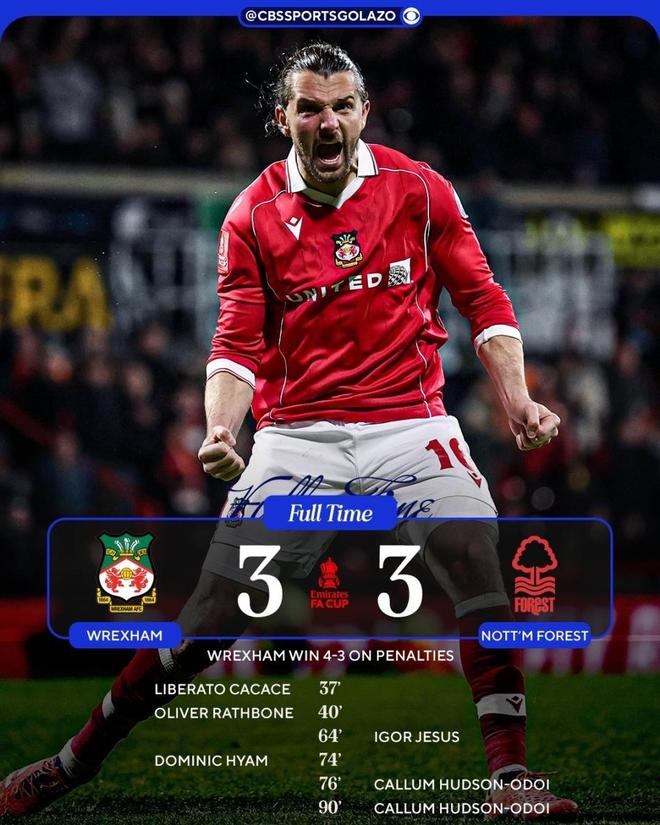 在北京时间1月10日结束的足总杯第3轮一场焦点战中,英冠球队雷克瑟姆在主场爆出大冷门,他们在120分钟内3-3战平英超劲旅诺丁汉森林,随后在点球大战4-3取胜,总比分7-6淘汰对手,晋级下一轮。