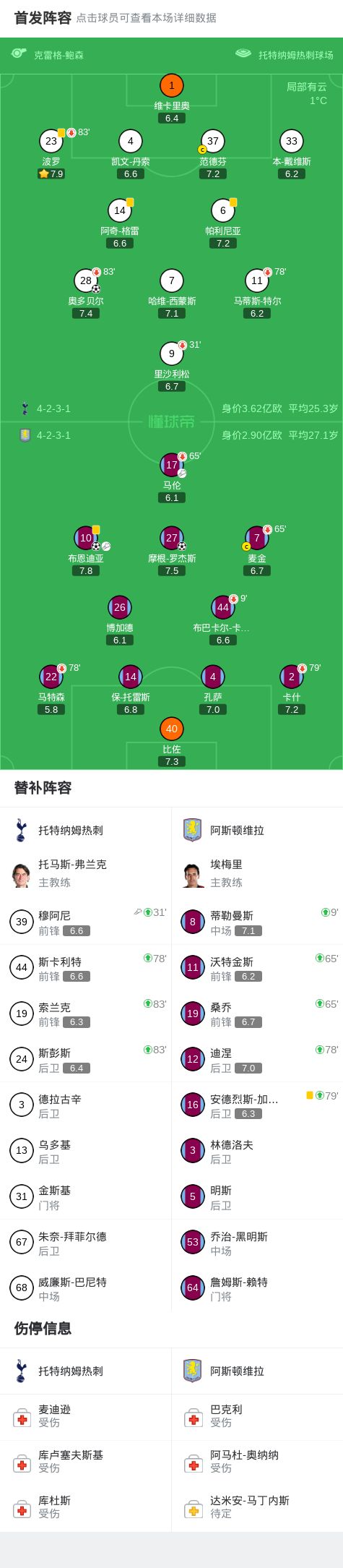 第45+3分钟,布恩迪亚脚后跟做球,罗杰斯破门,维拉2-0热刺