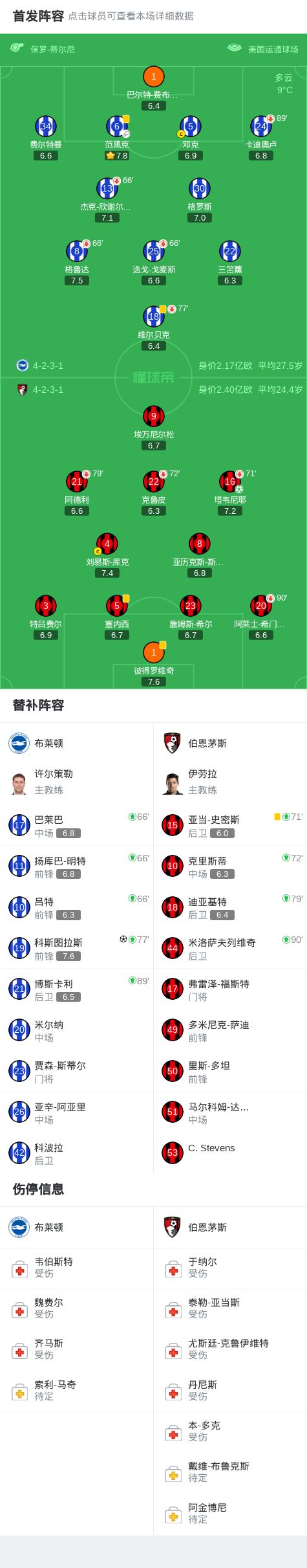 布莱顿11伯恩茅斯,科斯图拉斯倒钩绝平,塔韦尼耶点射