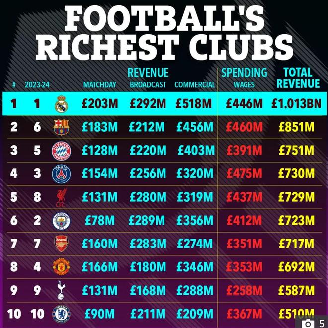 利物浦是英超唯一进入收入前五的球队,皇家马德里成为首支收入突破10亿英镑的俱乐部,紧随其后的是巴塞罗那、拜仁慕尼黑和巴黎圣日耳曼。