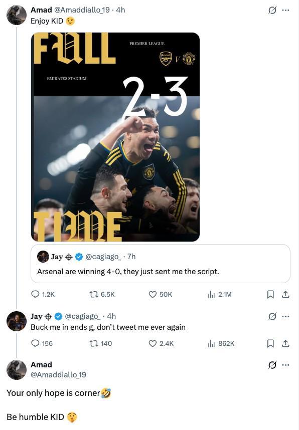 比赛结束后,阿马德引用了该条预测内容,并附上全场比分截图,写道:“好好享受吧,孩子。”