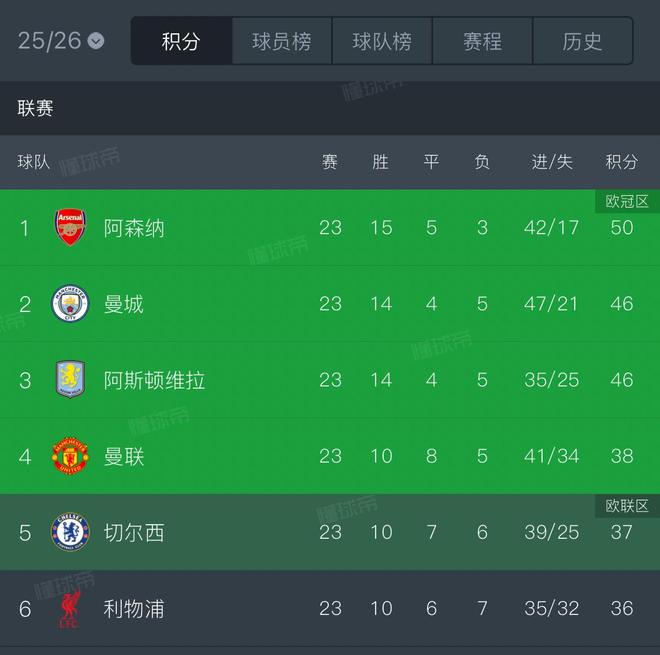 本赛季英超前六相互交锋积分榜