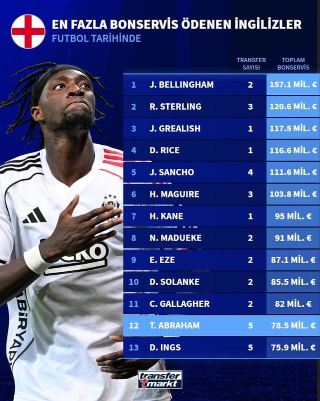 英格兰球员累积转会费排名:贝林厄姆第1,亚伯拉罕7850万第12