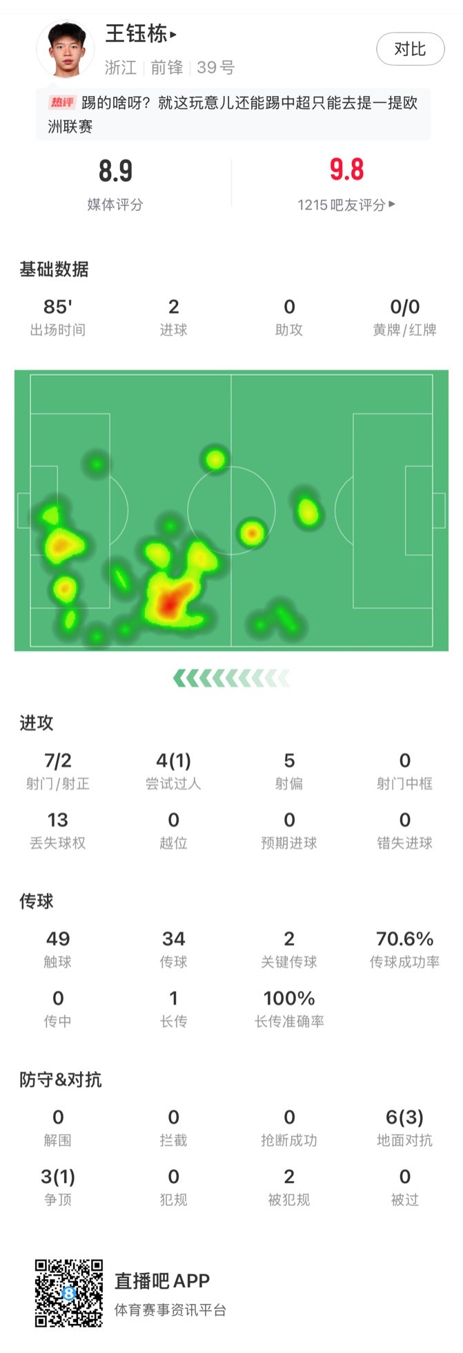 5月10日讯 中超第12轮,浙江队客战山东泰山,王钰栋首发出战85分钟打入2球,获评8.9分。