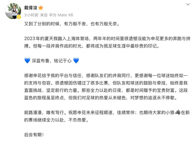 在申花官宣前的两个小时,戴伟浚已经在自己的社交媒体与俱乐部做了告别。