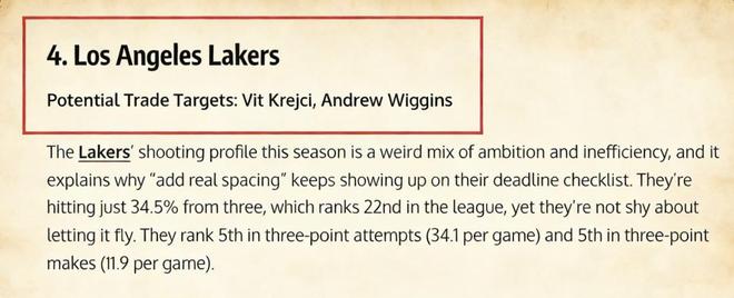湖人引援计划曝光,两大射手成目标,维金斯驰援东契奇